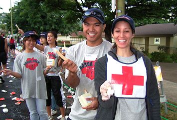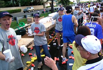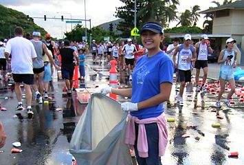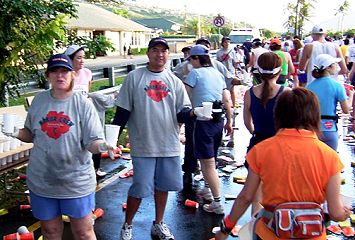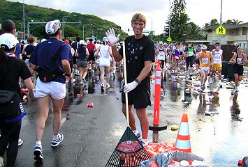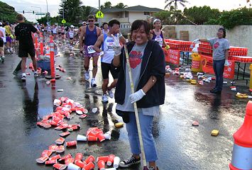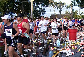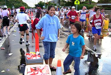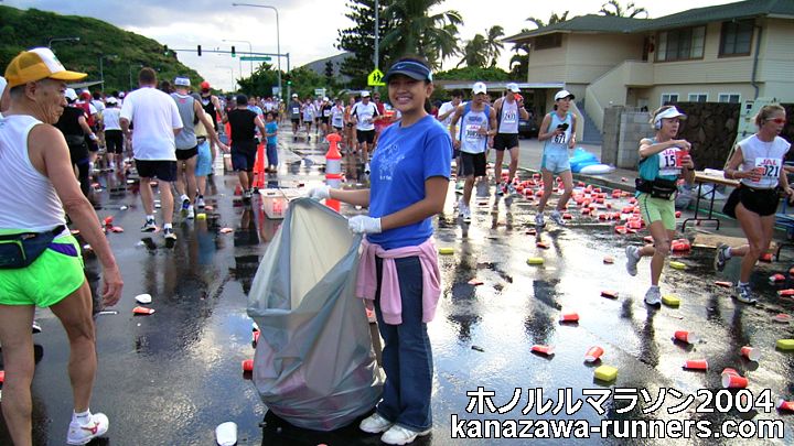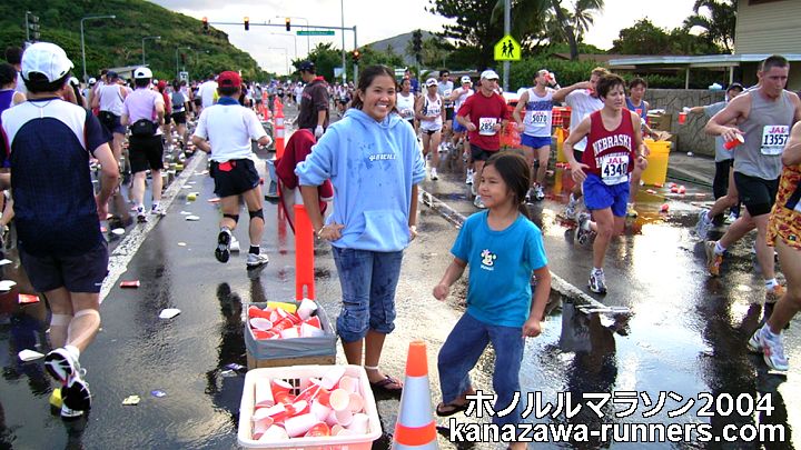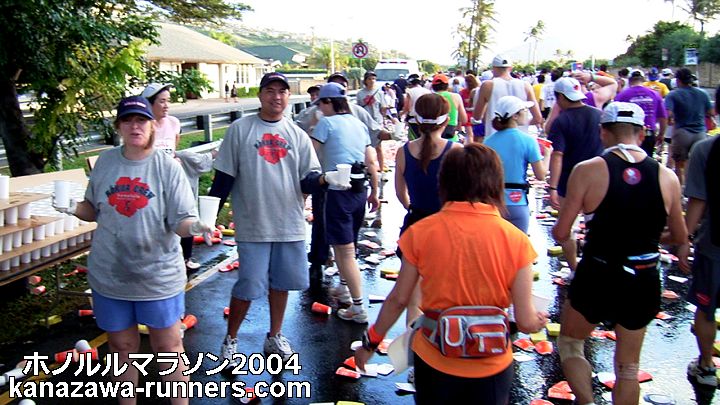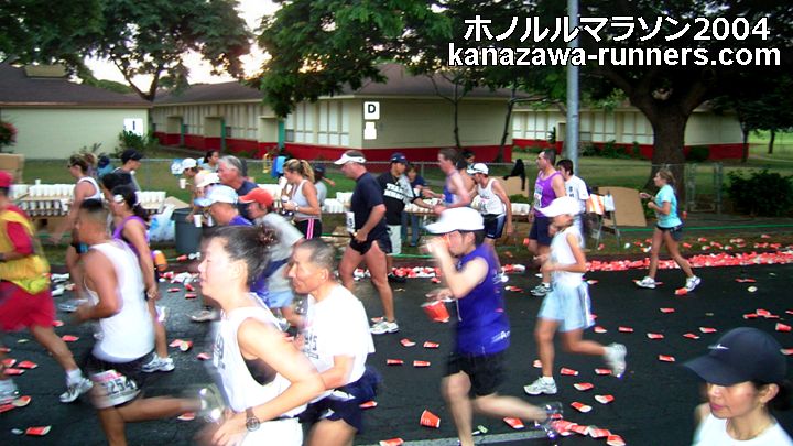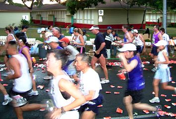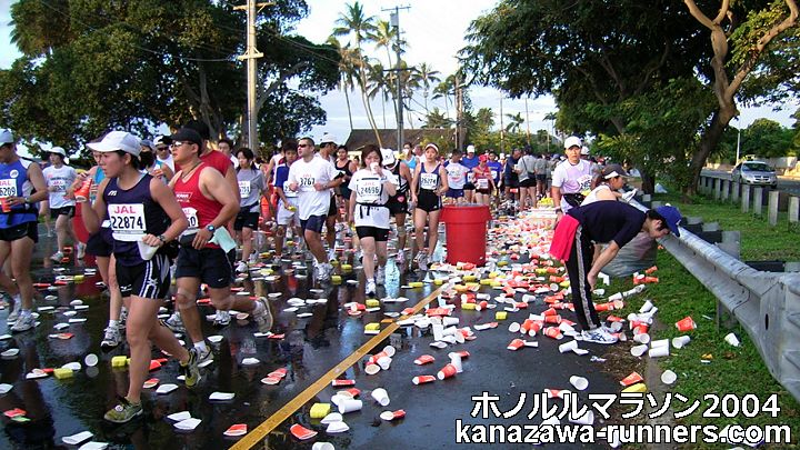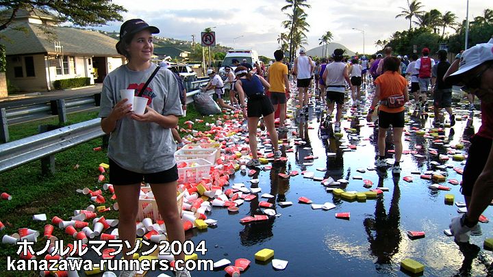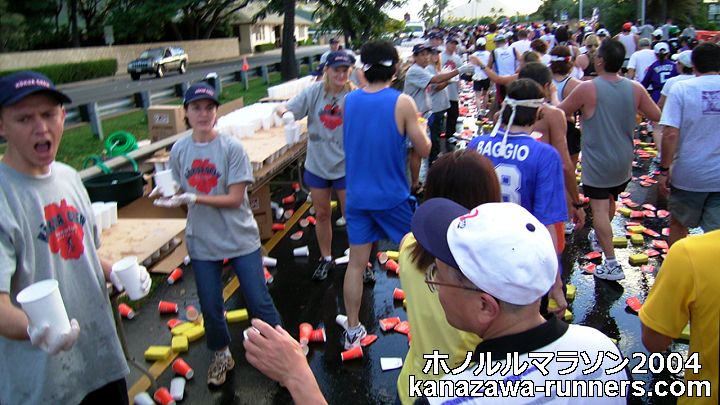 | ホノルルマラソンでは、給食サービスはありません。ウェストポーチに、バナナ・クッキー・梅干しなどを準備しています。コースの後半では、私設エイドでクッキーをいただいたこともあります。 給水は、これでもかというくらいボリュームがあります。紙コップのサイズが日本で使うもに比べて2倍くらいか、それになみなみと入っています。半分も飲めません。 エイドステーションは水浸しで、鏡のように青空を映しています。そしてコップのジュータン。これらもランナーや係員を組み込んで撮影します。 |