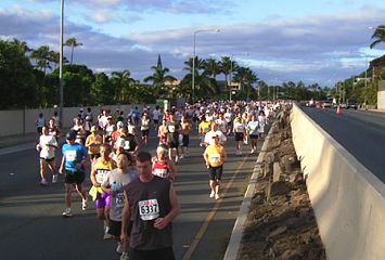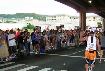 | 15マイルを通過。ハワイカイにきました。高速道路を左折し、住宅街を走ります。 地域の人たちの応援とクッキーサービスなどの被写体を楽しみにしているところです。 |