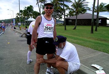 | ハワイカイを周回すると、高速道路にもどります。こんどは海側を走ります。 沿道の応援もま近かになります。そして30〜35kmのマラソンの壁といわれる距離にさしかかります。どんな被写体があるのでしょう。太陽は背後にあり順光に代わります。 マッサージサービスが嬉しい。撮影しようとカメラを構えたら、終わったところ。60過ぎの人を見つけてマッサージを受けてもらい、撮影しました。今度は貴方が受けろ、俺が写真を撮ってやる。このマッサージはとても力強く丁寧でした。 下駄で走る青年。撮るよというと、立ち止まってポーズ。そうじゃない、走っているところが撮りたい。こうした楽しい会話があるのです。 |