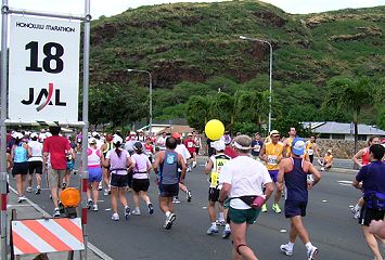 | ハワイカイを周回すると、高速道路にもどります。こんどは海側を走ります。 沿道の応援もま近かになります。そして30〜35kmのマラソンの壁といわれる距離にさしかかります。どんな被写体があるのでしょう。太陽は背後にあり順光に代わります。 ここでは、往路のランナーと対面走行になります。マイペースでゆっくり走る人、歩いている人。今まで走ってきた道をこれから進む人たちが沢山いるのです。さすが時間制限のないホノルルマラソンです。 |