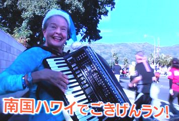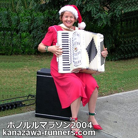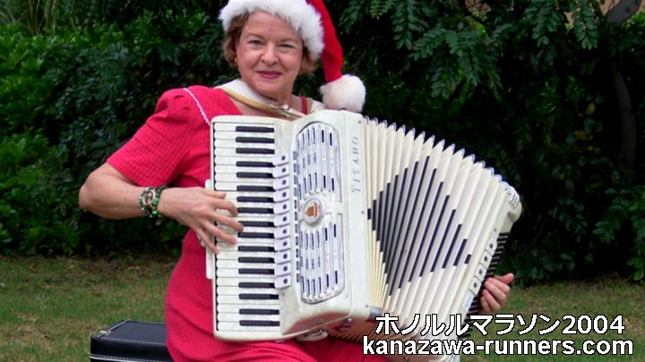| 2014年1月、NHK番組【ラン×スマ】でホノルルマラソンを取り上げた。久々に見るホノルルマラソン番組だ。アコーディオン演奏で応援のご婦人が紹介されていた。10年経過して、楽器や服装が代替わりしても、笑顔で応援されている雰囲気は変わっていない。 ※金沢マラソンでは、楽器演奏の応援は大切な被写体として撮影ランを楽しんでいます。 |