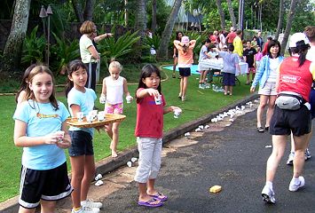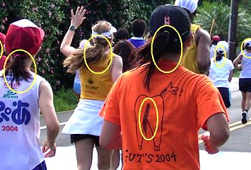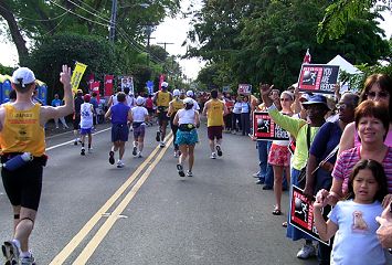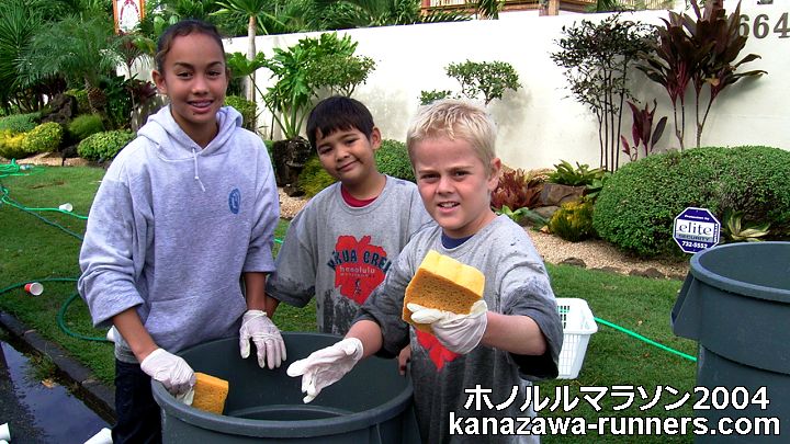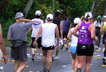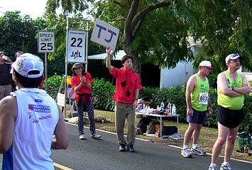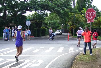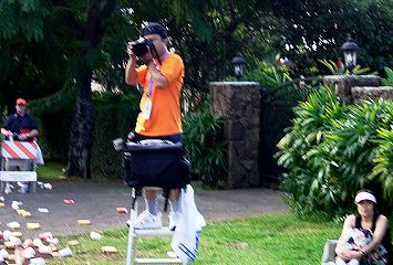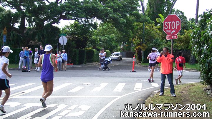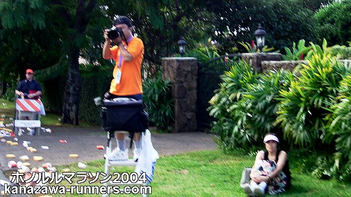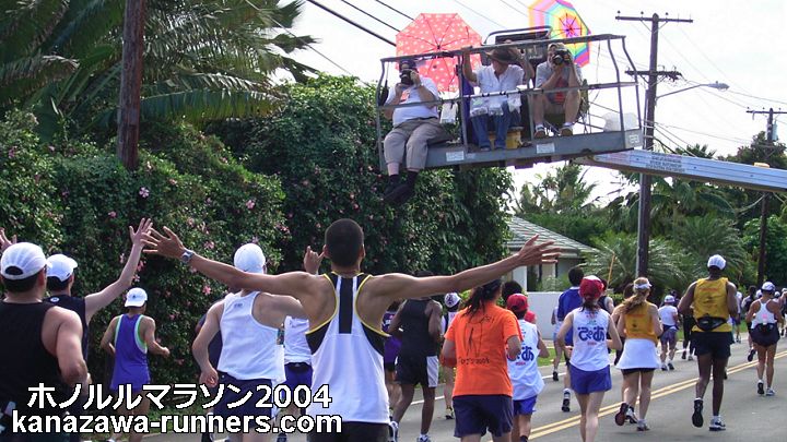 | カハラ地区は緑ゆたかな住宅街を走ります。ここでも、地域住民のサービスが被写体です。公認写真班の撮影もあります。太陽が南に回ってきて、正面からの日差しになります。 住宅街の左右の緑を楽しみながら走ります。エイドステーションを過ぎると、歩いている人が増えてきます。気温も上がってきます。スポンジを使って、顔や脚を冷やし気合を入れます。ここでのスポンジサービスは本当にありがたいのです。 『バドワイザー! バドワイザー!』と呼びかける声が聞こえます。小さなコップにビールサービスです。もちろん頂きました。ビールサービスはどこにあるかと探していましたが、今回はかなり後半のところでした。 写真班の撮影風景も被写体の一つです。写真コーナーの手前で1枚撮影。この写真にはポニーテールのお嬢さんが5人もかたまって写っています。手前の方のTシャツも馬のお尻のイラストです。ユーモラスな1枚をゲットしました。 |