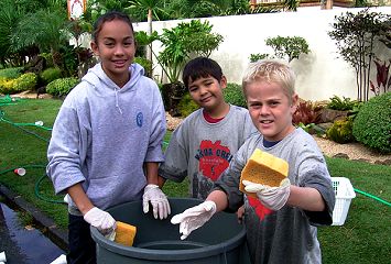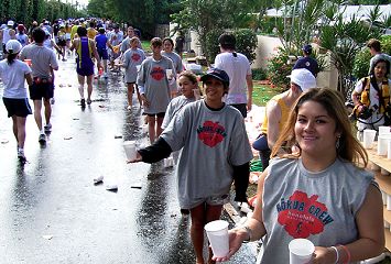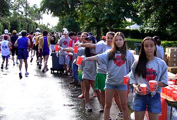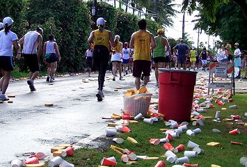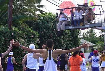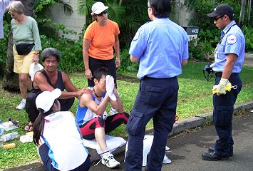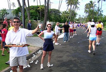 | 長かった高速道路を降ります。カハラ地区は緑ゆたかな住宅街を走ります。 ここでも、地域住民のサービスが被写体です。公認写真班の撮影もあります。太陽が南に回ってきて、正面からの日差しになります。 住宅街の左右の緑を楽しみながら走ります。バドワイザーと呼びかける声。小さなコップにビールサービスです。もちろん頂きました。写真班の撮影や救急車の出動もカメラに収まりました。 気温も上がってきます。スポンジを使って、顔や脚を冷やし気合を入れます。ここを過ぎると、最後の上り坂、ダイアモンドヘッドが見えてきます。 |