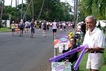 | 応援の人たちを撮影するとき、了解の声をかけます。車椅子で応援のご婦人。ピンクの服装が素敵です。合図すると、『写真を送ってね』と返事がありました。どうしましょう。 ここを過ぎると、最後の上り坂、ダイアモンドヘッドが見えてきます。 |