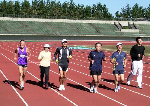 | 今年のホノルルマラソン参加者は、指導役の天野代表を含め9名です。 2004年11月23日(祝)。参加者の顔合せも兼ねて、合同練習会を県陸上競技場で行いました。 快晴。気温も16℃前後。ランニングには最高の日和です。 |