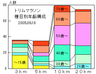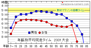 | ●取材マラソンの目標タイムは、平均完走タイムの少し前です。 2004年大会の記録新聞には年齢データはありません。このグラフは2001年大会の年齢別平均完走タイムです。年齢帯は、20〜24、25〜29のように5歳きざみです。 取材マラソンの目標タイム:4時間45分〜5時間15分は、平均タイムの少し前になります。 比較的元気なランナーと一緒に走ります。被写体としても楽しい雰囲気を出せると考えました。 この資料は、初参加の時にチェックしていました。昨年は、初マラソンでもあり5時間を意識して走りました。結果は4:50、目標をクリアできました。今回は、写真をシッカリ撮ろうとういうことで、5時間をオーバーしても、5:15を守りたかったのはこのグラフが理由です。 |