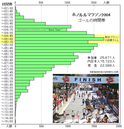 | ホノルルマラソンはお祭りです。大会参加そのものを楽しむことができます。初マラソンを2003年大会で無事完走。2004年大会はボランティアと応援をテーマにその楽しさを取材ランニングしました。 2004年第32回大会の参加者は25,671名。内日本人15,723名です。 22,388人が完走。最終は、15:00:07の4名です。中間の11,194番は、5:34:20です。 完走者のフィニッシュ時間の分布を調べるため、15分単位でフィニッシュした人数のグラフを作成しました。4:45〜5:00が一番多くなっています。 これは、私の取材マラソンのペースと同じ時間帯です。写真マラソンの被写体となったランナーは大会に参加した平均的な走力の人たちということになります。 年齢別ではどうでしょう。結構面白い数字がでてきます。 |