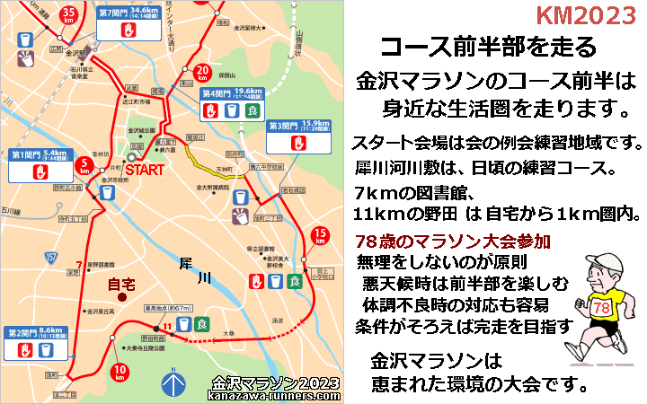 【金沢マラソン=スタートから20kmは身近な生活圏を走ります】 金沢マラソンの前半は自宅から5km圏内です。スタート会場まで3km。自転車で会場入りします。フィニッシュ会場へは、犀川沿いの練習コースを自転車で行くと9km。車道を走らないので安全です。県陸上競技場が会場の大会応援では渋滞がイヤでMTB(自転車)を使います。金沢マラソンでの帰りはバス利用です。 ●78歳のマラソン大会参加 スタート会場は走ろう会の例会練習の拠点。7km地点の泉野図書館、11kmの野田は自宅から1km圏内。コース南部の中心を流れる犀川の河川敷は、日頃の練習コース。このエリアは何かあってもすぐ自宅に帰れます。 後期高齢者になって、金沢マラソンは恵まれた環境の大会と実感しています。75歳からのマラソン大会参加は練習から大会後まで免疫力を落とさないよう無理は禁物としています。大会までの練習量と体調、そして天候不順が代名詞の金沢マラソン。大会当日を迎えるまで、どう走るかの計画を数通り準備しています。 大会参加で一番つらいのがスタートの列に小一時間待機すること。雨が降ったら最悪。靴の防水・防寒・ビニル傘で対応します。カメラ携帯では、撮影時の雨対策も必要。畳み傘を用意したこともあります。ビニル傘を使い、雨が上がったら背中とザックの間に差し込んで走ったこともあります。 ●悪天候時は前半部を楽しむ。 金沢マラソンの撮影計画は、前半の20kmまでをタップリ撮影、後半は撮影を少なくしてタイムロスを取り戻します。11km地点は町会連合会・公民館の応援スポットで、撮影は欠かせません。撮影マラソンでは雨は大敵。小雨程度なら対応できますが、カメラ本体やレンズが濡れて撮影になりません。2017年大会(72歳時)では、10km地点から降り始めた雨に雨具を脱いでカメラの保護に使いました。大会直前に帯状疱疹にかかったこと、降雨が続くことで予定とおり20kmで切り上げました。スタート会場に戻り、MTB(自転車)で帰宅。 ●天候・体調不良時の対応も容易。 コース20kmまでの途中ならば、身体の不調を感じたら対応が容易です。泉野図書館(7km地点)までくると自宅は1km。山側環状道路の野田(11km)で1km圏内。天候や体調に応じて、早めに切り上げることができます。 ●大会コースを楽しむ 大会前は試走をかねて、コースの一部を走ります。泉野図書館からコースに入り、天神町へ。椿原天満宮から小立野台地(石引1)に上がり笠舞3へ下ります。寺町台地(寺町1)へ上がって自宅へ。 アップダウンは本番コースの2回分です。距離を稼ぎたいときは、日頃練習している犀川コースを追加します。 |