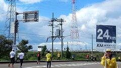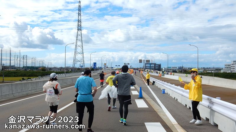 【海側環状道路を走る】 今回のコース変更で、千木町〜福久西〜木越西の沿道応援が外れた。木越わかばこばと鼓笛隊=子供たちの吹奏楽演奏は、毎回楽しみにしている撮影スポット。カカシなど地域の人達の工夫を凝らした応援。練習不足のランナーには脚の疲れが出始め踏ん張りどころ、マラソン終盤にむけ気持ちを入れ直す区間で、応援が励みになる。海側環状道路は高架橋の車専用道路を往復で3km、沿道応援はチラホラで寂しい。コース上空の青空と雲が慰めてくれる。毎年応援を楽しみにしていた地域の人達は、コースを外されて、どこに行かれたのでしょう。コース上では白山市のMさんが一人、私設エイドで飴を配布。彼女は毎回、こんな所でと思わせる位置取りで応援している。木越地区の応援団は、環状大浦の交差点に配置されていた。高架橋を下りてUターンし再度高架橋に上がる曲がり角、高架橋の陰で薄暗い。アッという間に通り過ぎてしまった。 |