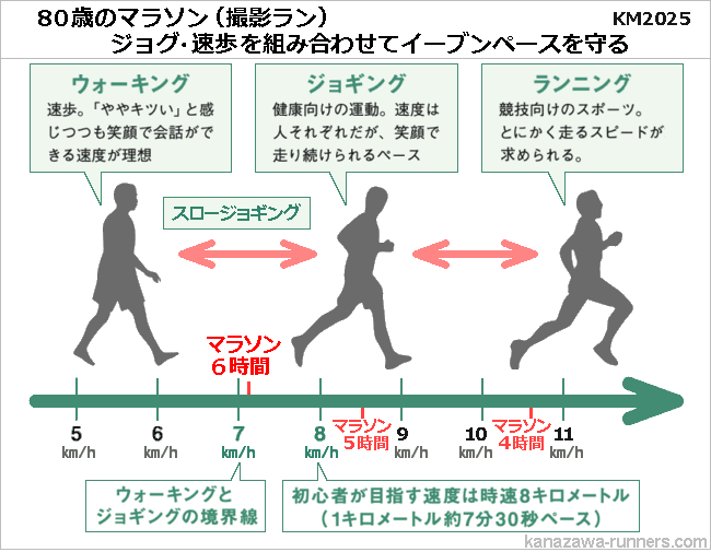 | マラソンは、現在の体力(持久力+走力)を把握して効果的に使うゲームだ。初マラソンは58歳。前半に歩きを入れて、後半にそなえた。完走してみると、もっと走れたのかと思うほどの余裕があった。2〜3年の練習で、4時間で走れる身体にできた。自らの練習で身体の変化を感じられる楽しい時間でもある。 終盤でトコトコ走るランナーを私の歩きで追い越すことも多い。歩かず完走などという目標は私にはない。42kmは長い。歩きを交えて速く走る。歩きをどう組み込むかの工夫が大切だ。 2000年コロナ禍以降、75歳の年齢を考慮して、免疫力を維持するため練習量を減らしている。 2021年大会・2023年大会では、20km以降で、脚のケイレンで歩きを交えることとなった。 2025年大会は80歳。ケイレンだけは避けたい。市内中心部が撮影のメインだ。それ以降を歩きを交えたゆっくりランで、イーブンペースを守ろう。 これまで多くのケイレン・ランを経験してきた。走りと歩きでは、使う筋肉が違う。ミネラルの消耗を、使う筋肉を代えることで回復させる作戦だ。 |