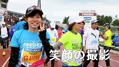 | A大会当日、取材と撮影 今日は、【ランxスマ】のインタビュー撮影から始まる。6時45分、MTB(自転車)でスタート会場近くの駐輪場へ。前2回は7時半頃会場入りしたが、今回は7時の待ち合せでTV取材を受ける。取材は30分。撮影取材する方がされる立場になると勝手が違う。取材を済ませ、会場の撮影を始めたいが何かしら気合が入らない。今日の最初の笑顔は、カメラマンのHさんだ。→〇取材内容の紹介は2017年大会編に掲載 |