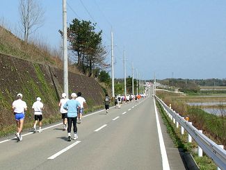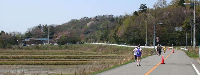 スタートの競技場は標高43.7m。コースの前半はアップダウンが続く丘陵地。後半は街中と田園・海岸コースです。海岸近くの標高は1.2m。これを往復するので、折り返し後の後半、フィニッシュまでの丘陵地がランナーの負荷を大きくします。このアップダウンの続く前半を、6分/kmのペースで順調に走ります。 昨年も往きは快調で、苦にもしなかった坂ですが、32kmで脚に痙攣がきてからは、復りにはこんなに坂があったのかとウンザリするほど。今回はどうなるのでしょう。 |