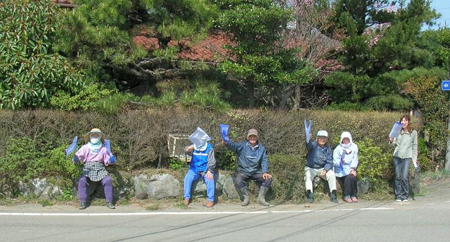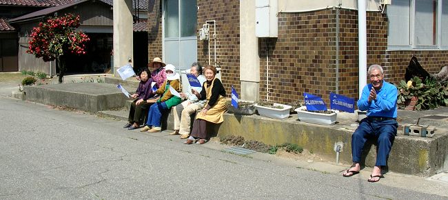 | 285(10:01)_応援。男性と女性陣の離れ加減が絶妙です。庭の椿も入れました。 | |
