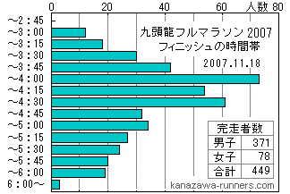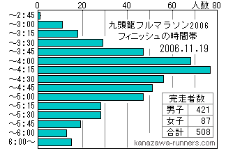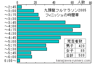 | 完走時間帯のグラフを昨年と比較してみました。参加者や気象条件で形が違ってくるのが分かります。 | |||||||||||||||||||||||||||||||||||||||||||||