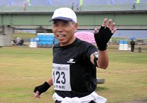 | s0833_Nさん(802)は初マラソンに挑戦。河川公園を2周し、コースにでます。 | |