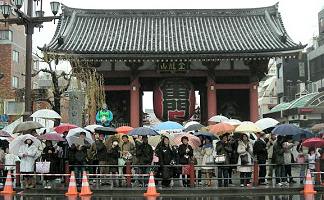 | 応援の定番になった名前のボード。 | 雷門前の応援は傘の列。 |