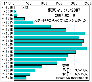 | ●完走率は、96.4%(車いす部門12名を含む)。 フルマラソンの参加者は26058人。7時間の制限時間に25131人が完走した。フィニッシュ時間帯は4〜5時間がピークになっている。力量のある市民ランナーが集まった(集められた?)結果だ。3倍の応募から絞られたものではないだろうか。それは冷雨の悪条件での完走率に表れている。それでも927人が棄権している。 |
