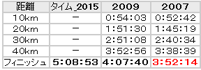 ●富山清流マラソン2007(63歳) 雨天の大会となった。カメラを貴重品テントに預け、ベストタイム更新を狙う。中間点で1:50。これはハーフマラソンのベストに近いタイムだ。ここからペースが落ちるが30kmで2:40は、5分20秒/kmのペースだ。30〜40kmも6分ペースまで落ちなかった。最後の2.2kmは給水所でオレンジを2切れ摂ったタイムロスとフィニッシュ直前の上り坂をラストスパート出来ず6分10秒ペースとなった。 |