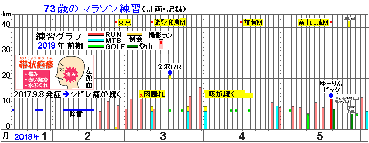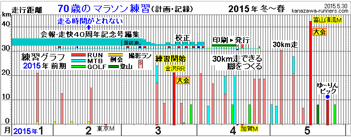 ●私のマイペース(=呼吸に乱れのない、会話のできる走り)は、気象条件、特に気温で変わる。8〜10℃位の時がサブフォーを気持よく走れている。70歳を超えた今でも、この気温帯がペース走の感覚が一番よい。好天時はカメラ携帯の取材ラン。雨模様の時がタイム狙いのスタイルは変えていない。年齢を考えるとこうしたマラソンも機会が少なくなる。ゆーりんピックの役員も隔年にして大会参加を優先しよう。 |