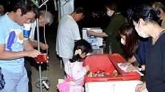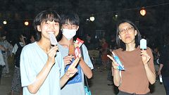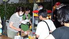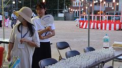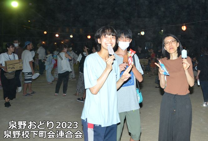 | 【泉野おどり2023=コロナ対策を一部解除】 舞台やぐらを低くして設置。花飾りなどの密集を伴う準備作業はしない。飾りは提灯のみ。焼き鳥やビール売店など飲食ブースを復活。抽選会は中止、アイスキャンデー配布で流れ解散。連日の猛暑、熱中症防止のためコップ給水所を設けた。 |