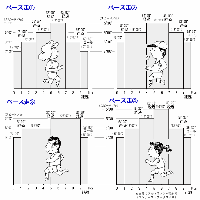 | 下図のようなぺース走を取り入れてみるのも良いでしょう。「ただ漫然と10kmを走る。1時間を走る」というのではなく自分で意図して「何kmまでどのくらいのスピードで」ということを考えて走るのも楽しいと思います。 |