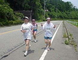 | 当会の3人娘(?)は、おしゃべりランニングに興じたとか。2時間50分で並んでフィニッシュ。 皆が首を長くして待っているのに。最初の一言が『あ〜。楽しかった。』 猛暑のレースは、これぐらいのゆとりが必要です。私たちは、小一時間待っている間に日焼けしてしまいました。 |