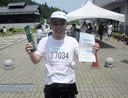 7月3日。午後2時。金沢を出発。能登島大橋を渡り、会場からハーフコースの前半となる道を通って、F目(えのめ)の民宿へ。漁港や突堤を散歩し、久しぶりに潮風を浴びました。 4日朝。コースの後半の道を通って会場へ。途中のハーフ:15km地点の近くに『がんばれ!!金沢中央走ろう会』の旗が立っています。早速記念撮影しました。さらに2km位行くともう1本。 この応援旗は、近藤芳子さんの手づくりによるもの。昨日たてられたのでしょうか? 勿論本人も出場されます。自らを鼓舞するとともに、仲間を応援する気持ちに感謝の念があふれます。 さて、当日は台風の影響でフェーン現象。30℃近い気温のなかでのレースとなりました。 前半はアップダウンの続く山中のコース。森林浴などという状況ではありません。後半はさわやかな潮風を受けての海岸沿いのランニングですが、日陰がなく何しろ暑い。私は、体力の消耗を抑えた完走ペース(6分/km)で対応しました。目標タイムは、2時間5〜6分。 スタートを過ぎると、沿道の応援は、本当にチラホラ。中間にあたるF目では宿のご主人も応援してくれています。12〜13km地点で、おばあちゃんが一生懸命応援してくれたのが印象的でした。そんななか、物言わぬこの応援旗は、当会の名前入りです。旗の近くに来ると脚が軽くなるから不思議です。 この大会では5kmごとに距離表示されている。5km:30分、10km:60分、15km:91分と予定のピッチを守もる。後半は暑さ対策で、水をかぶったり、給水をたっぷり摂取したので、2〜3分のロスがでている。最後は800mの登り坂。ラストスパートがきかせれなくて、2時間9分でフィニッシュ。 |