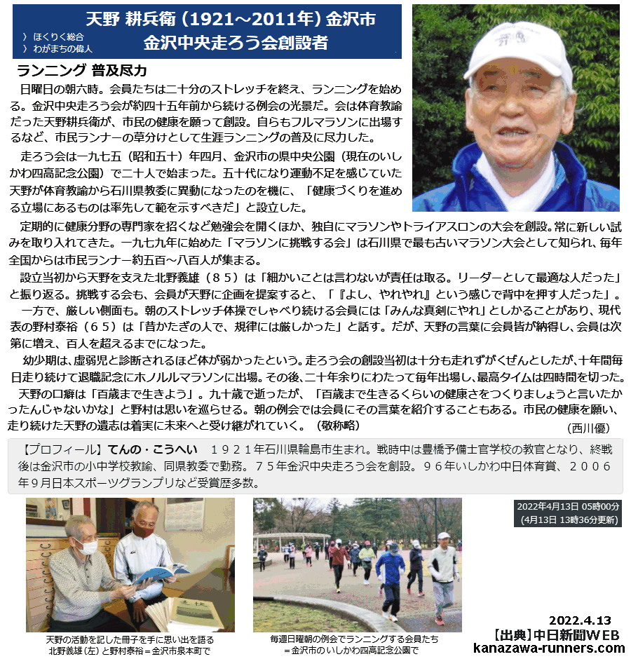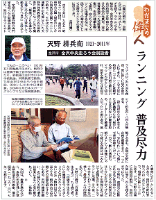 北陸中日新聞の特集記事「わがまちの偉人」で創設者:天野さんが紹介されました。「100歳まで元気に生きる」。市民ランナーの草分けとして生涯ランニングの普及に尽力したという内容です。※この記事は中日新聞のWEB版にも掲載されています。 【中日新聞WEB版】天野耕兵衛【ランニング普及尽力】 【参考】当会の活動紹介記事 ●2012年10月21日(日)北陸中日新聞 脈々と 日曜の朝 健康ラン ●天野さんの紹介、当サイトにも多くの記事を載せています。 ●会報:走快40周年記念号(2015年4月発行) 会の歴史と天野さんの紹介記事があります、参考にしてください。 |