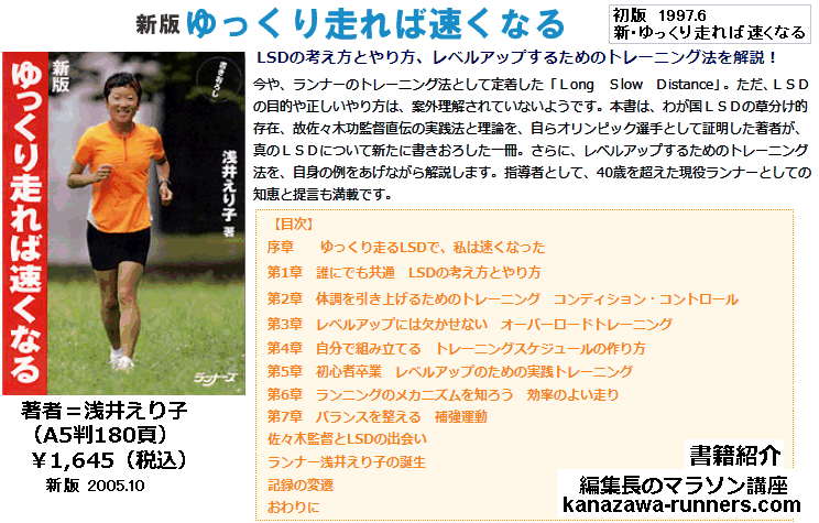 | 私の最初のマラソン教材は、浅井えり子【ゆっくり走れば速くなる】です。この本は、私のマラソン人生を一緒に考えてくれる教材です。マラソンブームで多数発行されているカラーや写真で眼をひき、自説を押しつけるような指導書が多い中、初期に発行されたこの本は、とても謙虚で丁寧です。最初に出会ったことで、マラソンを楽しむ今の自分に進化できたのではとも考えています。趣味として楽しむには自分で研究することが必要で、いろいろ試して技術を習得するのが楽しいものなのです。 | |