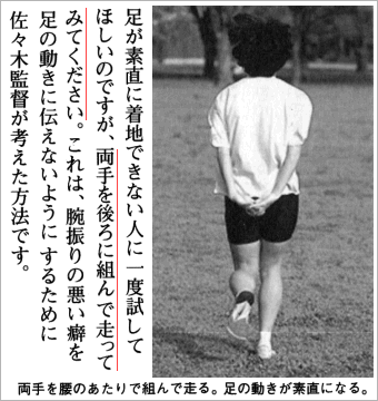 私の最初のマラソン教材は、浅井えり子【ゆっくり走れば速くなる】です。2000年、走り始めたころで、フォームに関心を向ける前です。たまたま目についたこのページ。両手を後ろに組んで走ってみました。まったく違った感覚ですが、なぜか気持ちが良くなるのが不思議でした。姿勢が良くなることで、視界が広がり、呼吸も楽になります。 ランニング初心者や会員で姿勢が悪い人に、この方法をアドバイスしています。 【注】図をクリックすると詳細図を表示します。 |