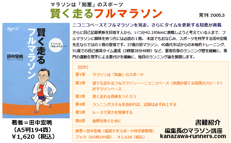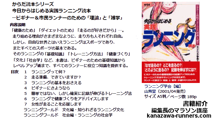 | 2003年春からマラソン挑戦を開始した。当時利用した参考書は、【ゆっくり走れば速くなる】。 ホノルルマラソン2003を4時間50分で完走。その楽しさから、来年はデジタルカメラを持って取材ランをしたいと決めます。2004年春に加賀健勝マラソン・マラソンに挑戦する会の2本を走り、走れる体つくりが進行していきます。 ホノルルマラソン2004の参加時期に始まったのがNHK趣味講座の【今日から始めるランニング】です。ここで使われていたイラストに興味を持ち、効率的なランニングフォームへの改善を始めます。 次に手にした参考書が【今日からはじめる実践ランニング読本=ランニング学会編】です。練習方法からランニング関連の雑学情報など盛り沢山。さすがランニング学会ならではの編集です。WEBサイト【走快】の運営を続けるなかで、全般的な情報を整理するのに役立ちます。 |