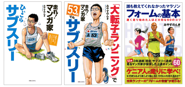 | 趣味とするスポーツや健康について多くの書籍を読んできました。識者の講演会や指導会も参考になります。テレビ番組も録画して見逃さないようにしています。これらからヒントを得て、さらに研究をしていきます。この習慣は70歳、75歳を過ぎても続いています。 マラソンのフォームについても沢山の書籍に眼を通してきました。自分が目指し、実施している方法が理にかなっているのかを確認しておきたいからです。その研究過程を本にしてあるのが、みやすのんき氏のマラソン書籍です。 ランニング入門書では、かかとから着地などの記述が多くみられ、私も疑問に思っています。これを最初に取り上げており、私と同意見。股関節の使い方なども私が工夫しながら取り組んできたものに収斂しています。15年前に出版されていればと思う内容です。こうした参考書が無かった分、自分流に楽しんでこれたのかもしれません。 |