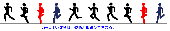 | @正しい前傾姿勢を保持していること。 前傾姿勢とは、着地足より体の重心位置が前にでていること。自然に脚が運び出される状態にするために行う動作だ。上体を、前かがみにしても、重心が着地脚より後ろにあれば後傾だ。その証拠に、脚は前にでていかない。 |