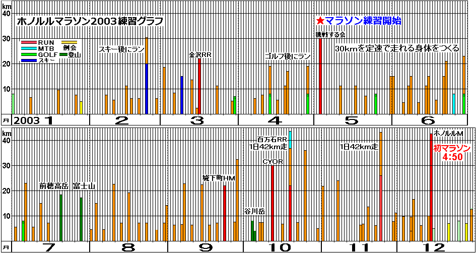 | 2003年は私のマラソン元年です。初マラソンの目標タイムは5時間。年末のホノルルマラソンに向けて、30kmを定速で走れる身体つくりをめざしました。 | |