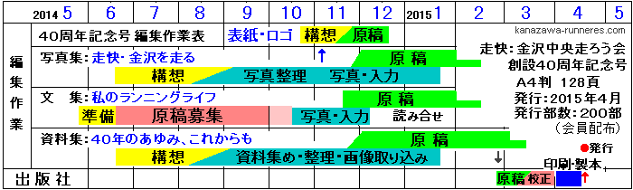 | 【2004年:WEBサイト開設】 2004年4月、WEBサイト開設。金沢中央走ろう会の活動広報を軸に、マラソン大会など地域のランニングシーンを記録・紹介しています。カメラを通して沢山のランナーの皆さんとの交流が楽しめます。これがイキガイ(?)でマラソン練習を続けています。 ランニングは練習量を多くとりたいことから、個人練習(夕方)を軸にしています。一般参加の大会・行事は広報担当としてすべて出席・取材してきましたが、例会(日曜早朝)は練習写真を撮るのと会員との顔つなぎが目的で適宜出席としていました。 【2015年4月:金沢中央走ろう会40周年記念誌発行】 2015年4月に会の創立40周年を迎えます。記念事業として記念誌を編集・発行することになりました。私が編集長に指名され、2004年6月から構想を練ります。WEBサイトの取材・編集で蓄積した資料・写真が活かせる機会です。会員の随筆に加え、会の歩みと活動写真の3部構成としました。延べ1000時間に及ぶ編集・校正作業となりました。 |