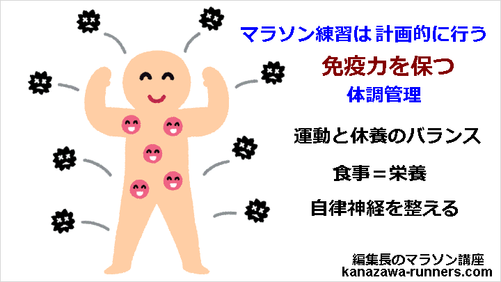 | ラン後の免疫力は大丈夫か。42kmを走ればそれなりに疲れる。疲れの回復までしばらく免疫力が下がる。3密を避けたい。会場からの帰宅にはバスの乗車もある。 | |