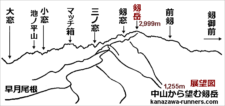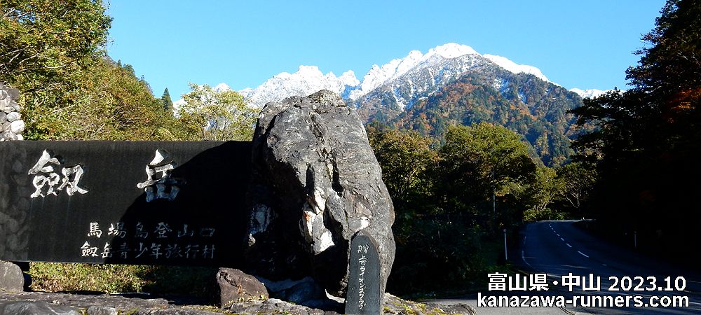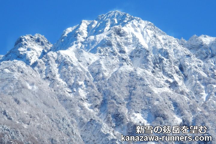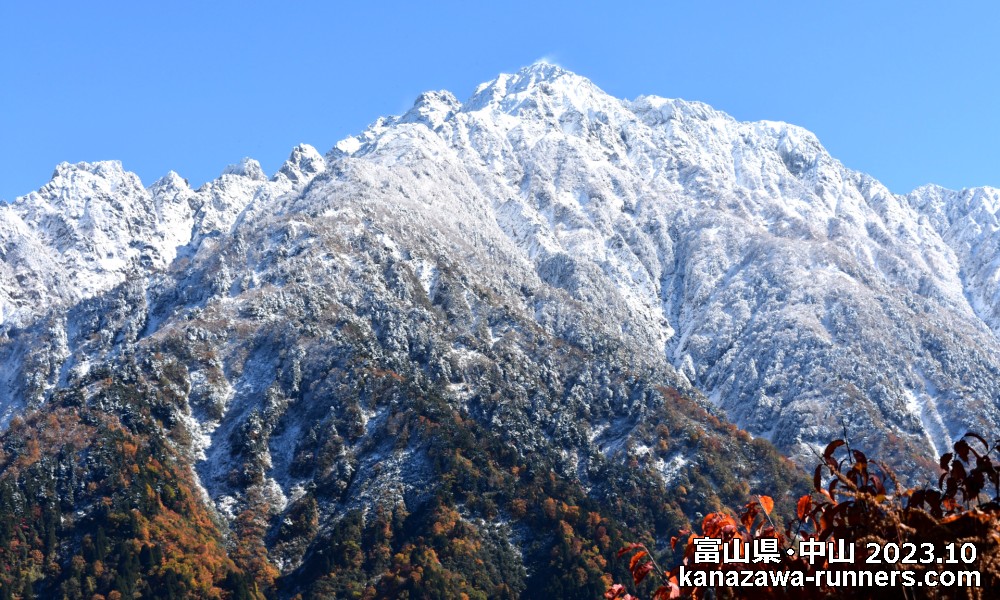 | 金沢マラソン2023の走り込み練習を済ませ、直前の仕上げは富山県の【中山=1255m】に登山。ここは剱岳の絶好の展望台だ。標高差600mの稜線を直登するので歩行距離は短いが勾配はキツイ。雲一つない青空に、新雪の立山連峰がまぶしい。いつも黒い姿の岩の殿堂・剱岳は真っ白に雪化粧。頂上付近は雪煙も見られる。右手には、2004年に登った剱御前から剱岳頂上に続く稜線。正面には、2014年に登った早月尾根。記憶を織り交ぜながら絶景を堪能した。 |