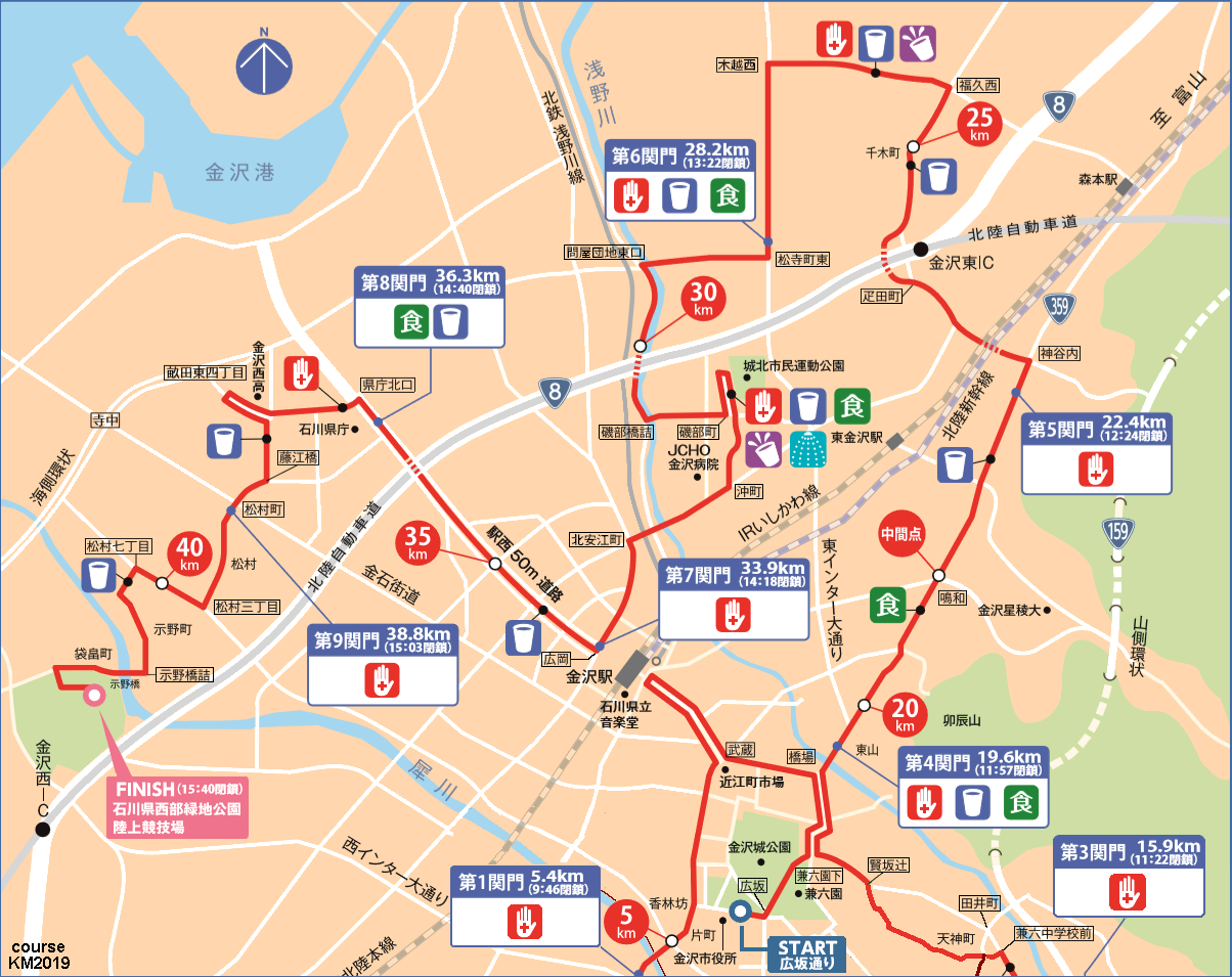 | 【金沢マラソン・コース】前半=スタート〜20km区間(南部)|後半=20km〜フィニッシュ区間(北部) |