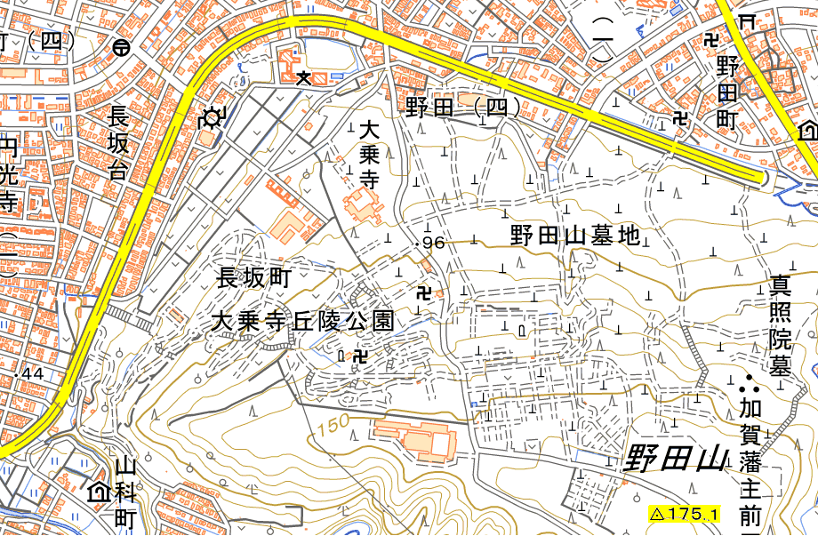 | 大乗寺丘陵公園=野田山の北西斜面(右下が頂上部=標高を参照) |