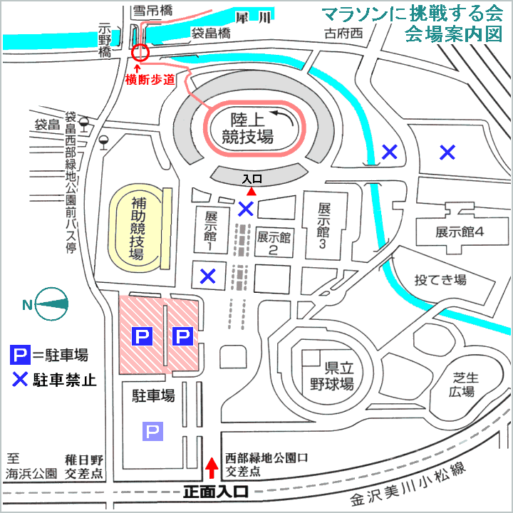 | マラソンに挑戦する会:会場案内図=県陸上競技場(西部緑地公園)=拡大 | |