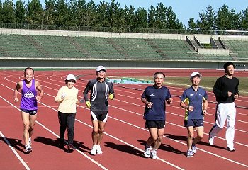 マラソン競技はロード(道路)を走る。練習でも距離練習や持久力向上のためロード走やクロスカントリー走などが主になる。競技場での練習はトラック1周400m、これを周回する。走路はウレタン舗装されて脚にやさしく走りやすいが単調になる。体育館の走路は1周200〜300mでさらに単調になる。その分、目的意識を持つことが大切だ。 ロードレース大会の発着会場として競技場を走るが、トラックを楽しむ感覚まではない。初めて競技場を利用したラン練習は2003年11月。ホノルルマラソン2003の直前距離走です。引率の天野さんが市営総合グランドを予約して練習会をおこないました。広い空間を数人で独占して走る。こんな経験は初めてです。シッカリ走らなければと気がひきしまる思いをした。 翌く2004年ホノルルマラソン参加は、県陸上競技場で距離練習をおこないました。 |