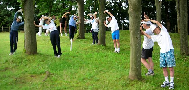 | 芝生広場でランニング前のストレッチ。木の間から強い日差しが差してきました。 |