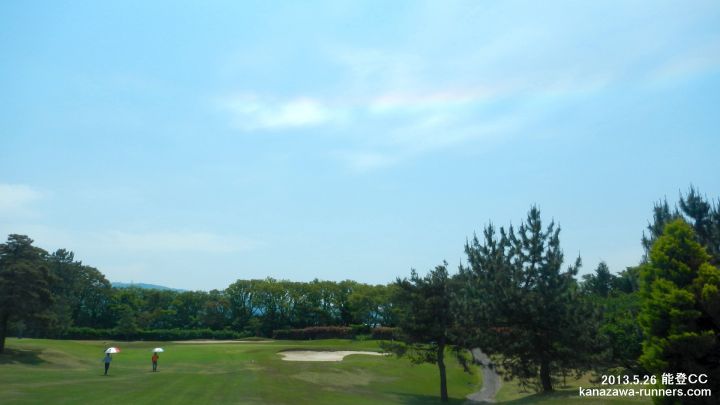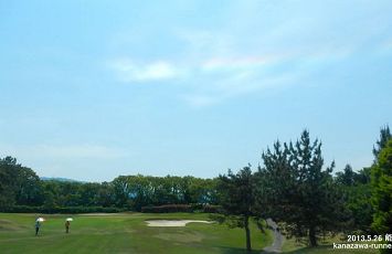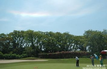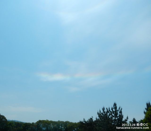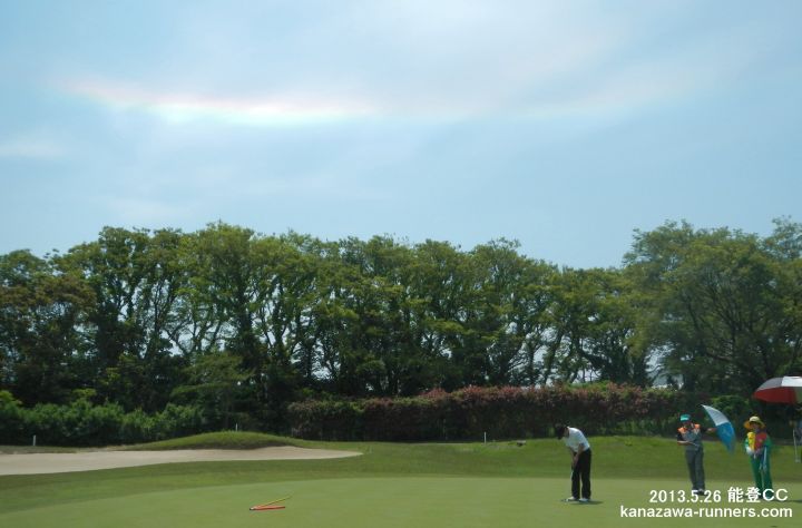 | 今日のスタートは、6:48、1番組だ。前にプレイする組がないので、スムーズなプレイ。2時間弱でOUTを終了。INになると、2ホール目のショートコースで3組の待ちとなった。6番ホールでティーショットし、歩き始めて上空に虹が出ているのを発見。以前にも、この現象に遭遇したが、自動車の運転中でカメラに収めることができなかった。進行する南北方向に開けた背景も良し。ゴルフバックからカメラを取り出す。撮影タイムは10:43〜10:53。虹の色は濃淡が変化するので、プレイの合間にシャーッタを押す。このホールの前後は、虹を背にするコース配置なので、タイミングの良い撮影だった。7番ホールのティーショット前で撮影を終えたが、色が薄くなっていた。 |